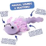 Discover a new world of friendship with the interactive Fingerlings Baby Axolotl, Auggie! This adorable axolotl swims and lights up in rainbow colours as soon as it touches the water - be it in a bowl, aquarium, or pool (sold separately). With sensors that detect when its in water, Auggie automatically starts swimming.