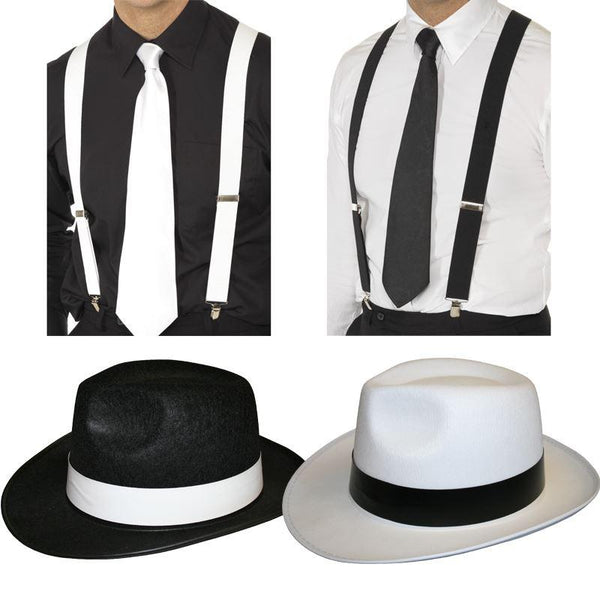Gangster Hat, Tie & Braces set. Fantastic for 20's and gangster themed fancy dress parties. You will receive braces, a tie and a gangster hat with colour band. One size fits all. Choose from black and white.
