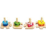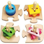 - Includes jigsaw base with four pegged pieces and nine stacking shapes