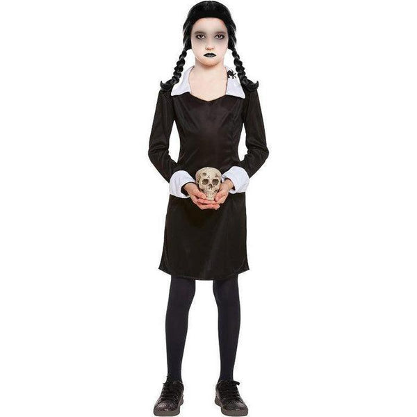 Description: This gothic scary daughter costume is perfect for Halloween fancy dress parties! Includes a black dress with white cuffs and collar with spider detail.