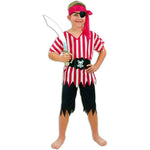 Description: This four piece Pirate Costume consists of a red and white striped, short sleeved top and a pair of knee length trousers, both with jagged finish along with a self-tie headpiece and a velcro fastening belt with Jolly Roger print.