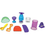 Mold shapes and transform them with the shaper; slice and dice with the slicer; scoop balls of Kinetic Sand with the scooper; use the crinkler to cut waves, and squish your creations with the squisher tool!