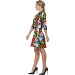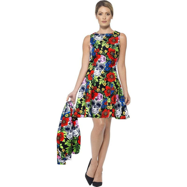 Ladies Day of The Dead suit costume. Dress up in this fantastic dress and jacket this Halloween. This smart and spooky costume features a sugar skull and flower print.