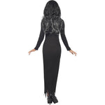 This ladies Halloween fancy dress costume features a long tube dress with long sleeves and skeleton print design