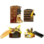 The outrageous accordion package makes Queen Bee's picture shorter and taller as you push on it, and it becomes reusable dressing room playset.