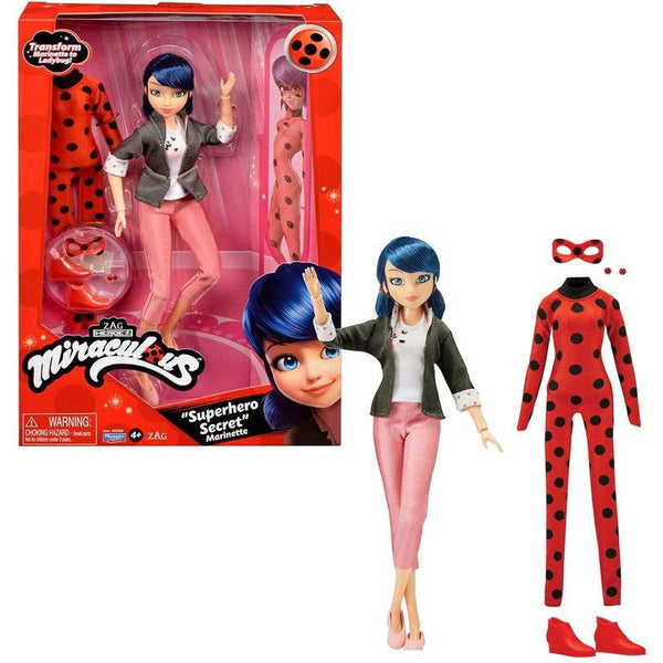 Bring Miraculous to life with these deluxe 26cm Feature Dolls - listen to Ladybug's catch phrases with the Talk & Sparkle Doll, keep Marinette and Adrien's identities safe with the Superhero Secret Dolls, and let Marinette transform into Ladybug in the flick of a finger with the Sequin Transform Doll!