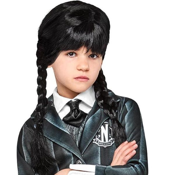 Description: Complete your Wednesday Addams costume with our stunning black wig with braids! This wig is perfect for anyone who wants to add some gothic flair to their dress-up collection.