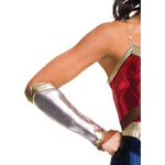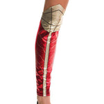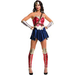 Description: This Wonder Woman costume for women is an officially licenced product from Justice League. The costume includes a dress, bandana, wrist pads and a pair of leg pads (shoes not included). The Wonder Woman dress is short, with red on the chest and a blue skirt. The wrist pads are silver and the leg pads red and gold. The bandana is gold and completes the costume perfectly. Wear this Wonder Woman costume for a superhero fancy dress party!