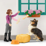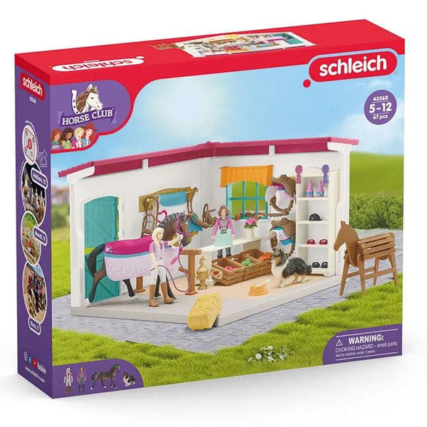 Ding-dong! Customers are arriving at the schleich® HORSE CLUB riding store. What special treat will you pick up for your horse? Horse feed, saddles, brushes...this tack store has everything! There's even a friendly dog to help you find what you need. Load up your pack, then it's time to head back to the stables...sorry, you can't escape your stable chores by shopping all day.
