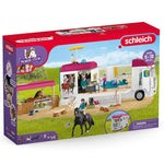 - Contains - 1x transporter, 4 car seats, 1x straw inlay, 1x table, 2x chairs, 1x kitchenette, 1x ladder, 4x fence, 4x wooden inlay for fence, 1x horse box seat flap, 2x curtain, 2x wooden inlay, 1x backpack, 1x barbecue, 6x transport gaiters, 1x barbecue tongs, 1x water ball, 3x sausages, 2x corn cobs, 1x water hose with end piece, 1x broom, 1x pitchfork, 1x water container with pump. 2x obstacle poles, 2x ZZ hanging pole, 2x saddle stand, 3x bridle, 3x saddle, 1x straw bale, 3x plate, 3x cup, 1x parasol, 3x bottle, 1x flower vase, 3x hay net, 4x obstacle tree trunk, 1x bone, 2x carrot, 1x hay, 1x bouquet, 1x curry comb, 1x card brush, 3x helmet, 1x helmet, 1x couch, 3x horse, 1x golden retriever, 2x cloth blanket, 3x pillow, 3x saddle blanket, 3x stable halter, 1x horse blanket, 3x human figure