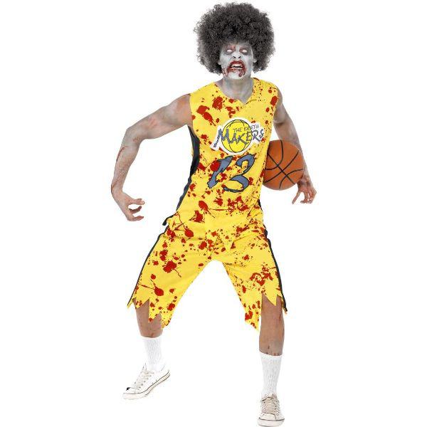 Description: This genius Zombie Basketball Player costume is ideal for any man looking to head back to school as a scary zombie! Be the captain of the basketball team and scoff some brains! This awesome costume includes a yellow top with red splatter and matching shorts