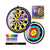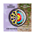 - Board features a traditional-style dartboard on one side and an archery-style target on the other