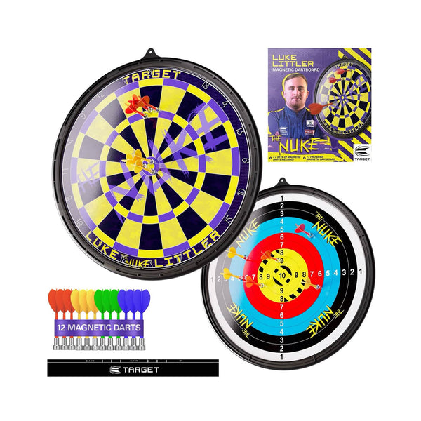 The officially licensed Luke Littler Magnetic Dartboard Set from Target Darts is the perfect way to get kids into the game of darts. Designed in collaboration with "The Nuke" himself, this set introduces kids to the game in a safe and fun way. The 12 magnetic darts supplied are designed to stick securely to the board without the frustration of dropping out and without the sharp points of standard darts.