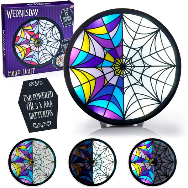 Description: The Wednesday mood light has 4 different functions that help display the iconic replica window mood light at its best. You can either hang the Window light on the wall, in the style of Wednesday and Enid's room or use the stand provided to display on your shelf or sideboard.